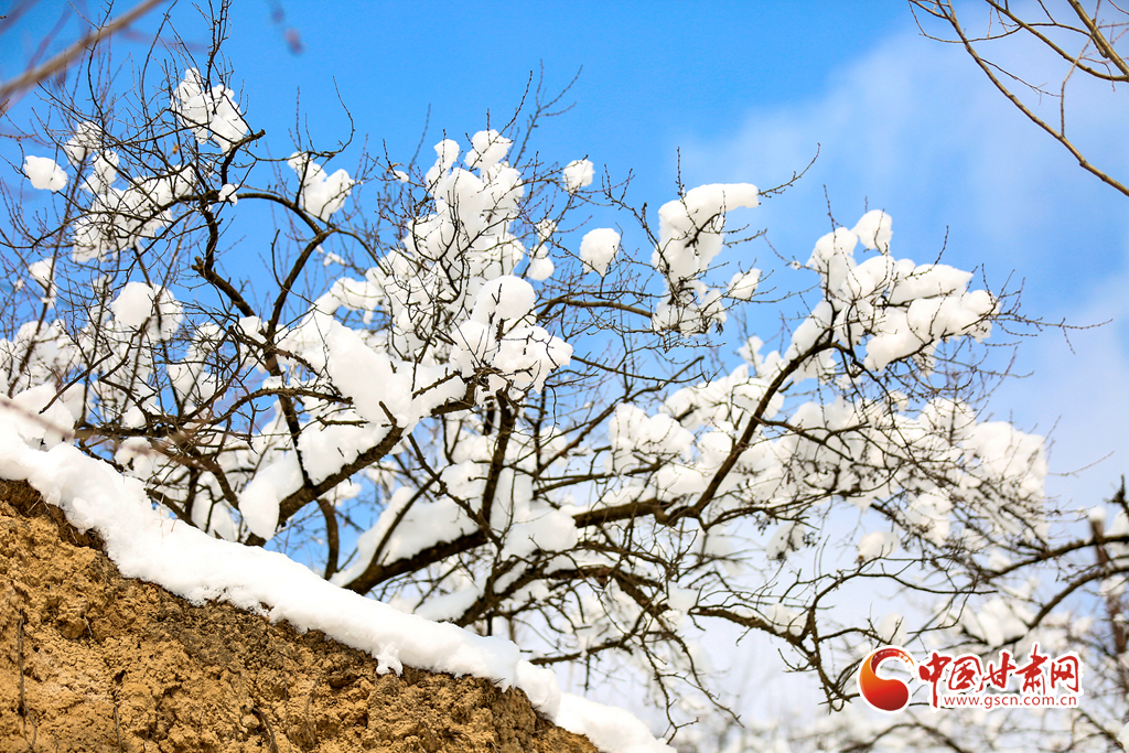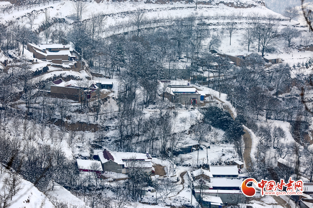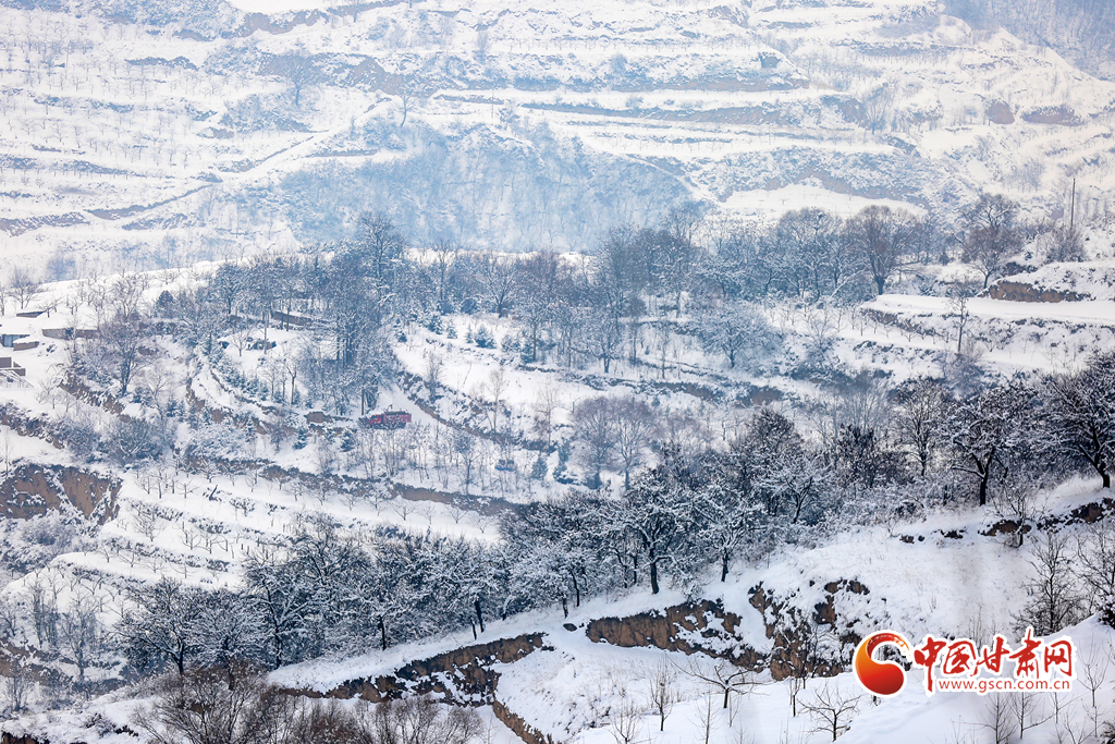 2月8日,雪過天晴,甘肅省平涼市靜寧縣賈河鄉侯山村銀裝素裹,美不勝收。果園、梯田、房屋、公路及遠山構成了一幅天然的鄉村畫卷。
