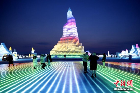 2月21日,游客在3D感應冰面上拍照。連日來,冰雪大世界的客流量迎來小高峰,單日客流量可達四五千人。 中新社記者 姜輝 攝