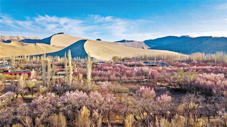 原標題:敦煌鳴沙山下千畝(mu)杏花競相綻放