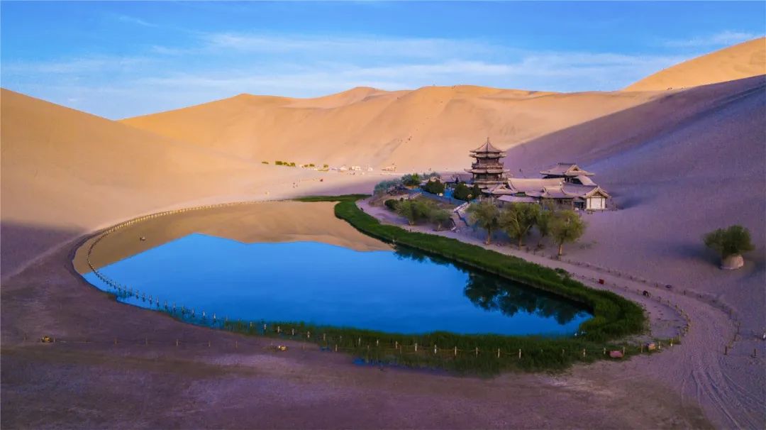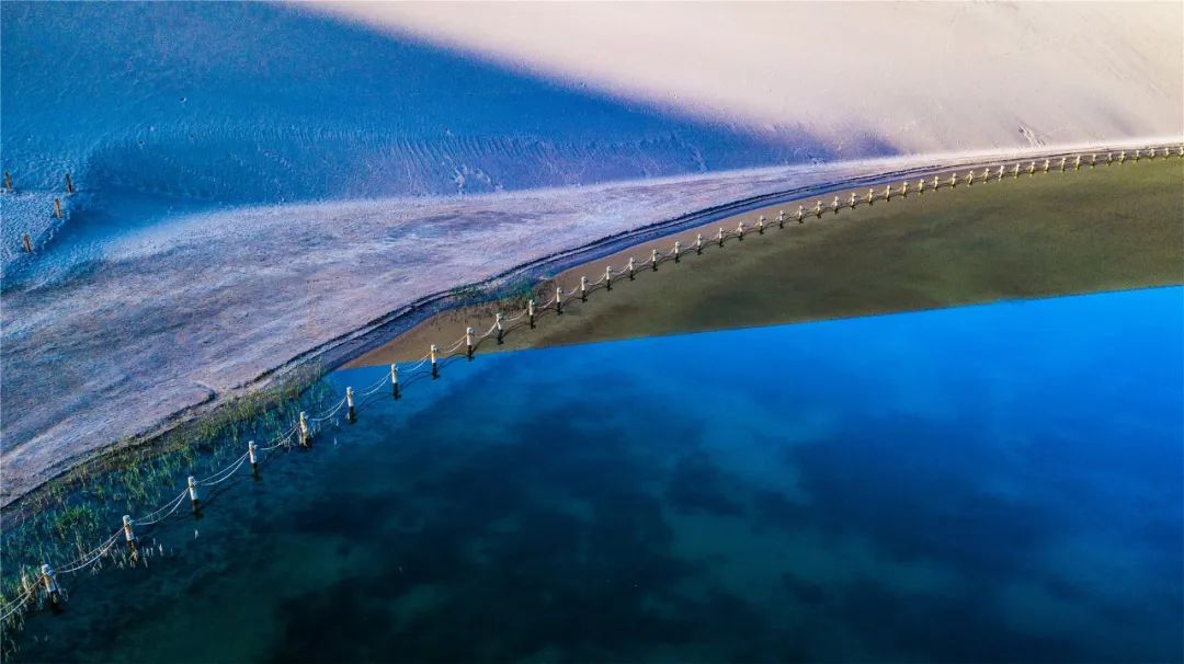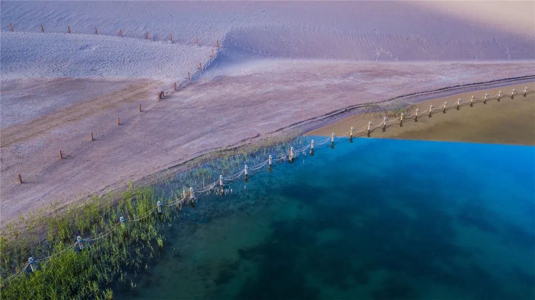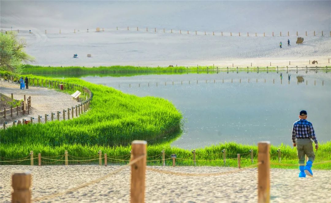 今年4月,敦煌市氣候溫潤,雨水較多,鳴沙山月牙泉景區草木蔥蘢,月牙泉水位持續上升。從4月23日在月牙泉航拍的圖片可以看出,月牙泉水域面積逐漸擴大,泉水已滲出月牙泉圍欄之外近1米的距離。據悉,3年前月牙泉泉水一直保持在圍欄之內。