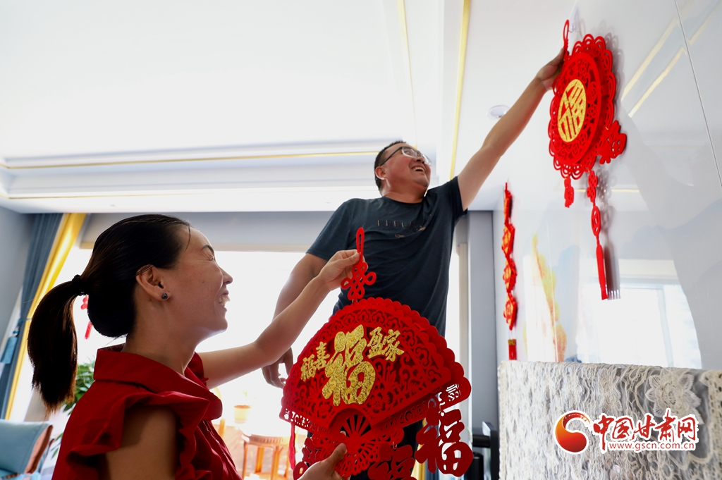 8月30日(ri),張掖市民樂縣(xian)搬遷(qian)到樂民新城新居的一(yi)家人正在(zai)墻上掛(gua)福字。