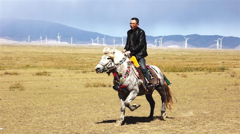 驅車向草原腹地進發,遠遠就能看見有人在馴馬。馴馬者房利軍和他的坐騎“尕青”仿佛“人馬合一”,同呼吸、共步調,一遍遍練習,像走,更像飛。這便是傳說中的走馬文化,和跑馬的加速度不同,走馬不管是走還是跑,都是快步勻速,短途速度快,長途耐力強,騎乘平穩,姿態優美,觀賞性強。在牧區,走馬實用性強,深受當地人歡迎。曾有專家稱,“馬踏飛燕”的“馬”即為走馬。每天,和武威天祝一山之隔的這片草原,都與房利軍有關,在這里,他專心馴馬,而他的500只羊則在一旁撒歡。尤其從高空俯瞰,草原牧羊的畫面甚是壯觀。看完馴馬,房利軍騎馬帶路,采訪車沿著馬道回到了“家”。