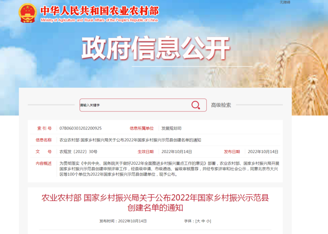 農業農村部、國家鄉村振興局開展的國家鄉村振興示范縣創建申報評審工作近日完成,北京市大興區、河南省蘭考縣、四川省眉山市東坡區等100個單位為2022年國家鄉村振興示范縣。其中甘肅省會寧縣、民勤縣、臨澤縣三地上榜。