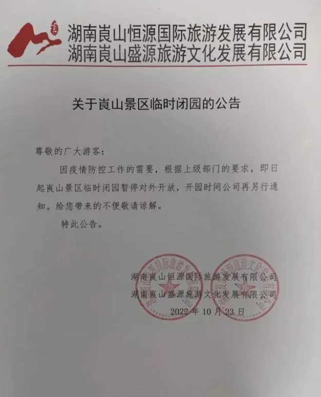 - 2022-10-25湖南隆回:所有A級景區已陸續暫停對外開放