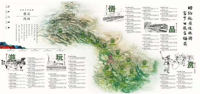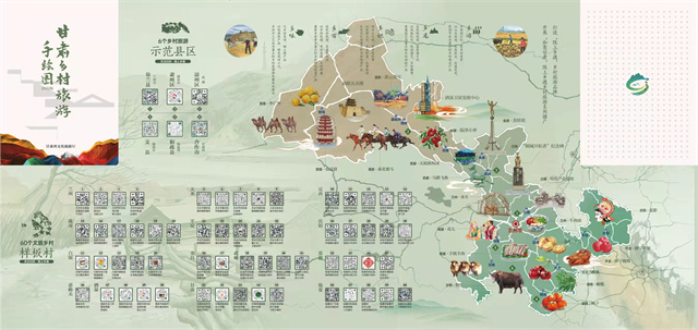 據介紹,手繪圖以“相約隴原促振興·富了口袋富腦袋”為主題,突出“圖文并茂、服務游客、便于攜帶、適于珍藏”等特點,對2022年創建的6個鄉村旅游示范縣,60個文旅振興鄉村樣板村全部開發設計了電子“二維碼”,設置了甘肅省鄉村旅游60條四季精品線路,生動形象地展現了甘肅鄉村旅游特色元素和資源產品信息,對幫助游客暢游甘肅鄉村、感知隴原文化、體驗鄉村魅力具有重要意義。