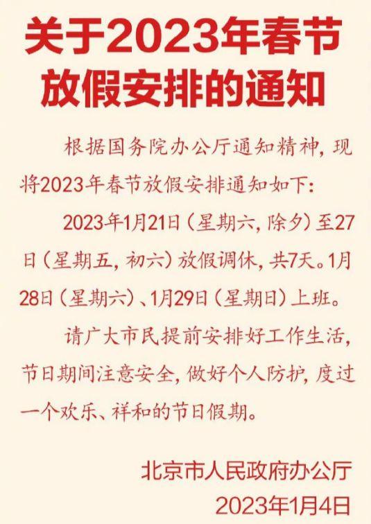 1月4日,北京市人民政府辦公廳發布《關于2023年春節放假安排的通知》(以下簡稱《通知》)。《通知》指出,根據國務院(yuan)辦公廳通(tong)知精神,現將2023年(nian)春(chun)節放假安排(pai)通(tong)知如(ru)下(xia):2023年(nian)1月(yue)(yue)21日(星期(qi)六,除(chu)夕)至27日(星期(qi)五,初六)放假調休,共7天(tian)。1月(yue)(yue)28日(星期(qi)六)、1月(yue)(yue)29日(星期(qi)日)上(shang)班。