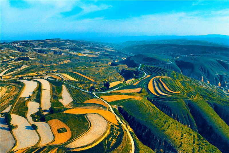 固原梯田分布于寧夏南部六盤山區,始于上世紀60年代,是當地群眾堅持戰天斗地“坡改梯”、既種莊稼又種風景,“一任接著一任干,一張藍圖繪到底”,精心打造的一項規模宏大的綠色生態工程。美輪美奐的梯田鑲嵌在黃土高原上的每一處褶皺上,條條田壟如鏈似帶,從山腳盤旋至山頂,層層疊疊,高低錯落,形成春賞山花、夏觀梯田、秋品紅葉、冬覽水墨的四季畫卷,被譽為最美的大地“指紋”“中國最美旱作梯田”,入選“中國美麗田園”10項梯田景觀之一。寧夏梯田看固原,固原梯田看彭陽。彭陽梯田既是黃土高原上梯田的縮影,也是黃土高原生態治理的典范。近年來,打造的金雞坪梯田公園、嘛喇灣梯田公園、青云灣梯田公園三大核心“五彩梯田”公園,每年4月“山花旅游節”游人如織,在“77號彩虹路”加持下,成為新晉網紅打卡地。