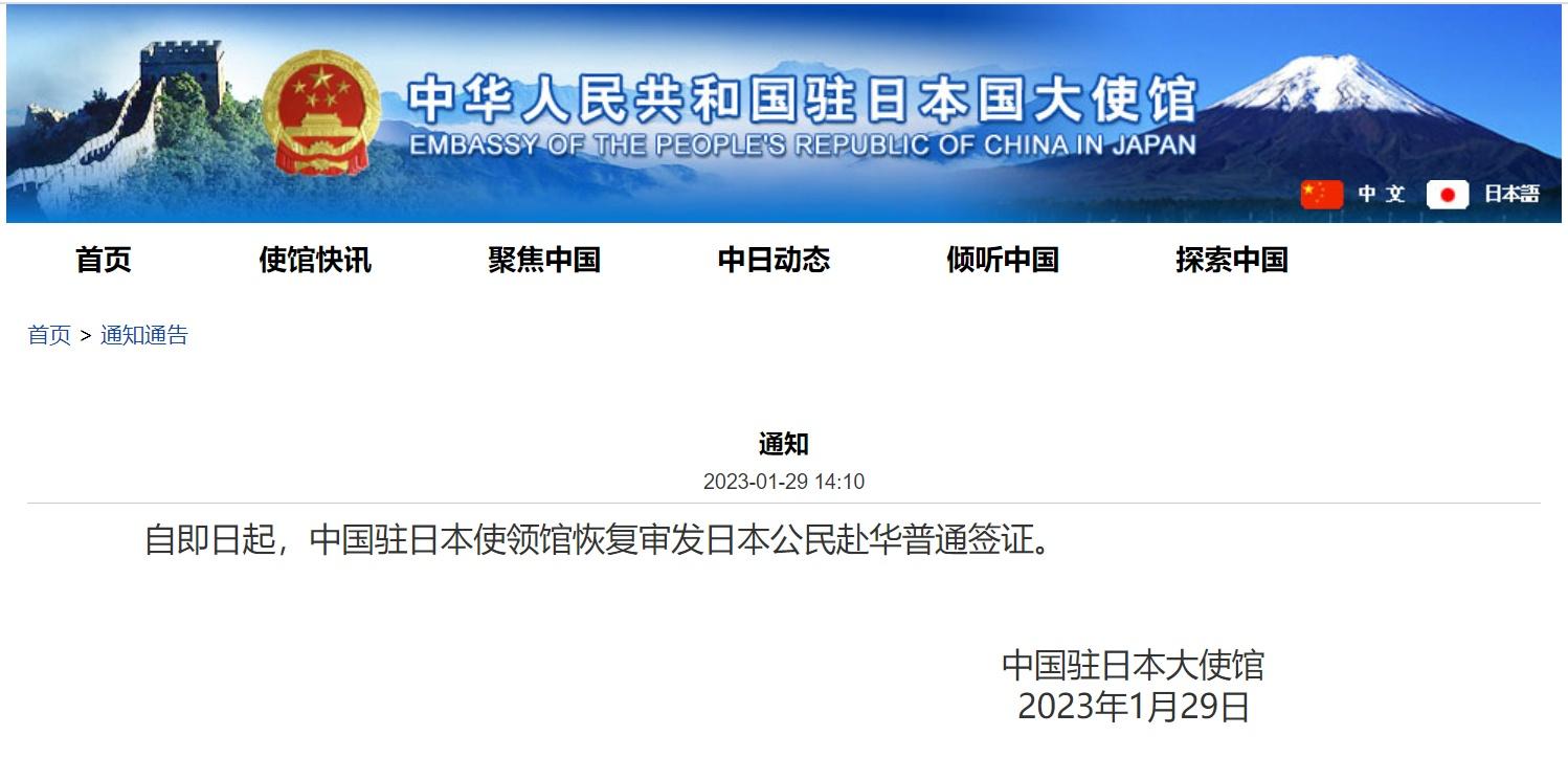 中國駐日本使領館1月29日宣布:自即日起,中國駐日本使領館恢復審發日本公民赴華普通簽證。