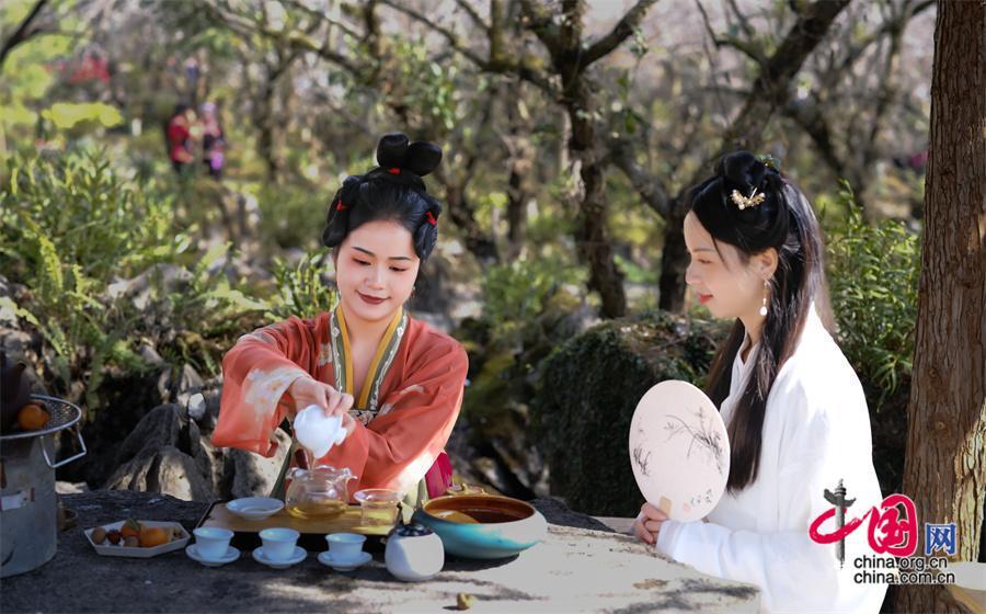 一朵梅花寓五福,一山梅花賀新春。梅原里,游客們或賞花祈福、或獨自品溫,或拍照打卡,盡情享受賞梅樂趣。還有不少游客,為了應景,更是穿著古風漢服或少數民族服飾,沉浸式打卡梅花節,游客林女士說:“古裝配梅花,清麗脫俗,既感受到傳統文化之美,也為賞梅之旅增添了色彩。”