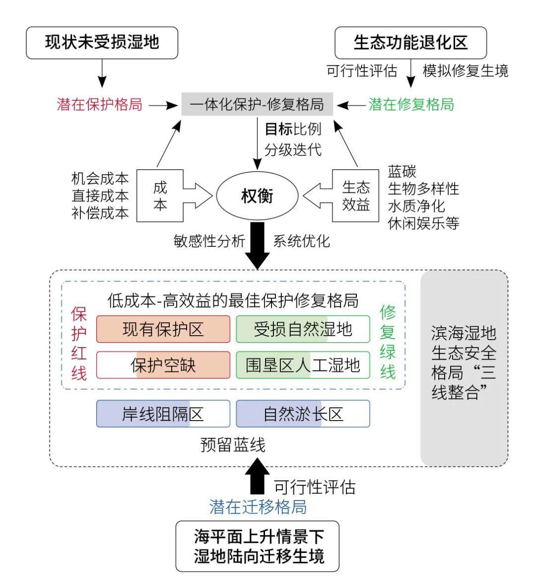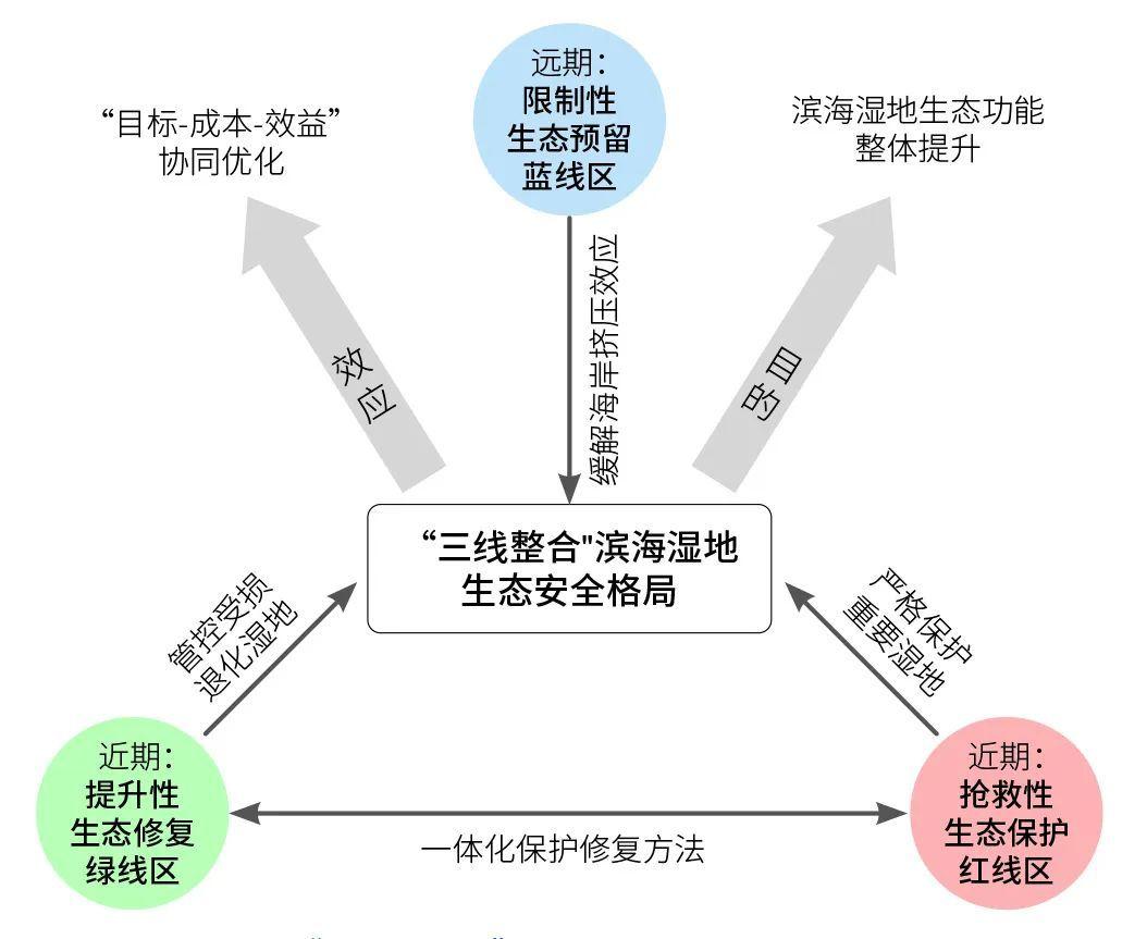 其(qi)概念構(gou)架強調一體化整合保(bao)護(hu)與修復格(ge)局(ju),同時兼顧濱海濕地(di)應對海平面上(shang)升(sheng)的(de)長期(qi)適(shi)應性,構(gou)建(jian)對濱海生態(tai)(tai)系統整體功能提升(sheng)最惠(hui)益(yi)的(de)生態(tai)(tai)安全(quan)格(ge)局(ju),包括(kuo):近期(qi)搶救性生態(tai)(tai)保(bao)護(hu)紅線區(qu)(qu)與提升(sheng)性生態(tai)(tai)修復綠線區(qu)(qu),以及遠期(qi)限制性生態(tai)(tai)預留藍線區(qu)(qu),由(you)此構(gou)建(jian)應對圍墾開發和(he)適(shi)應未(wei)來海平面上(shang)升(sheng)情形下,基(ji)于“三線整合”的(de)濱海濕地(di)生態(tai)(tai)安全(quan)格(ge)局(ju)(圖1)。