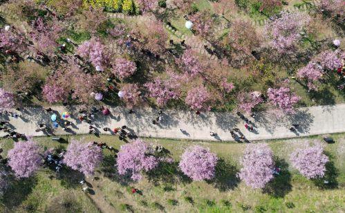 這(zhe)是3月8日拍攝的(de)都江堰(yan)市青城(cheng)山鎮(zhen)“問花村”櫻花大道一角(無人機照片)