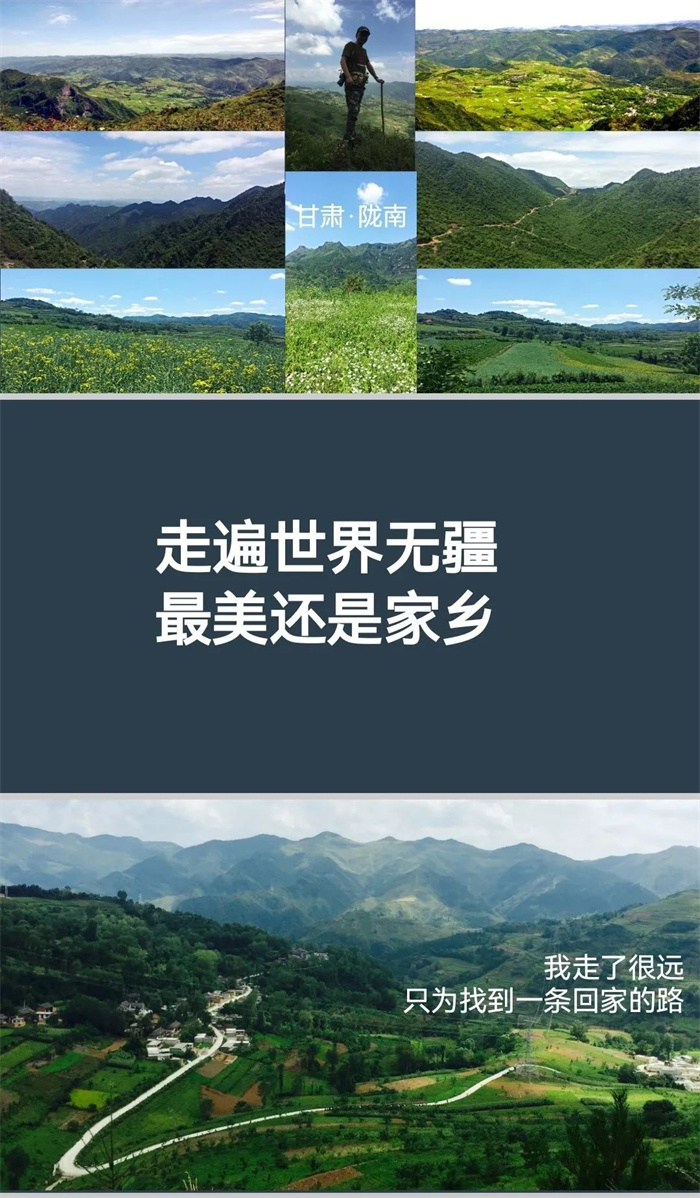 我(wo)每次回到西(xi)北各省區參(can)加活動(dong),做(zuo)演講分享時,總會(hui)放幾頁PPT介紹(shao)我(wo)的(de)家(jia)鄉(xiang)——大隴南,配圖都是(shi)(shi)我(wo)拍攝(she)的(de)我(wo)們(men)村莊附近(jin)的(de)風光,也經常說一(yi)句(ju)話——“走遍世(shi)界無疆,最美還是(shi)(shi)家(jia)鄉(xiang)”,不辭長作隴南人。