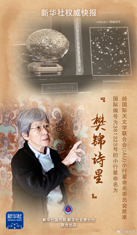 7月10日,樊錦詩從事敦煌文物工作60年座談會在敦煌舉行。會上正式命名了編號381323小行星為#樊錦詩星#。繼向北京大學捐資1000萬元支持敦煌學研究后,樊錦詩再向中國敦煌石窟保護研究基金會捐資1000萬元,用于敦煌文物事業發展和急需人才培養。捐款來自樊錦詩所獲獎金及個人積蓄。(記者:張玉潔 施雨岑 張智敏)