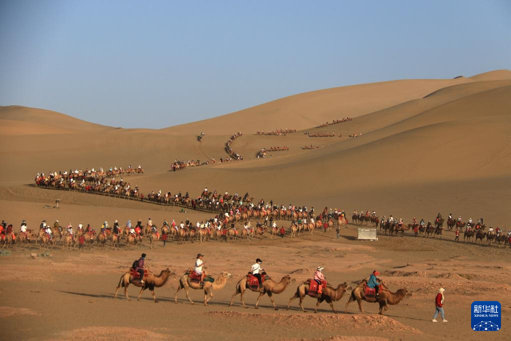 8月20日,游(you)客在甘肅省敦煌(huang)市鳴沙山(shan)月牙泉景區游(you)覽。新(xin)華社發(張曉亮(liang)攝(she))