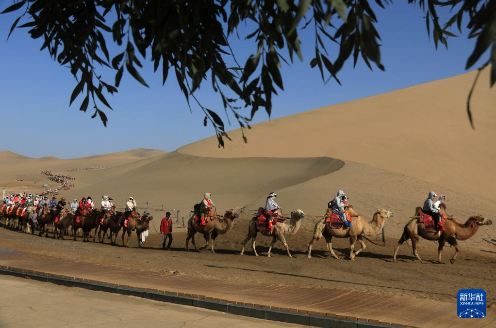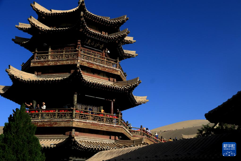 初秋時節,甘肅省敦煌市碧空如洗,鳴沙(sha)山(shan)月牙泉景區景色如畫,引人入勝。