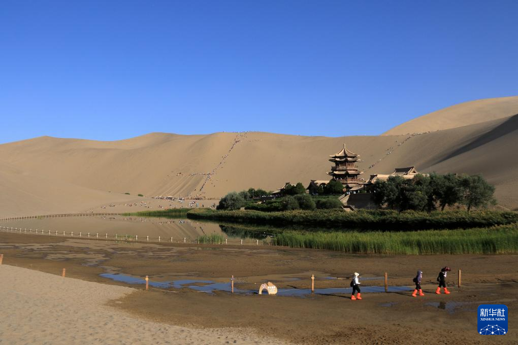 8月(yue)20日,游客在甘肅省敦煌市鳴沙(sha)山月(yue)牙泉景區游覽。新華社(she)發(fa)(張(zhang)曉亮(liang)攝)