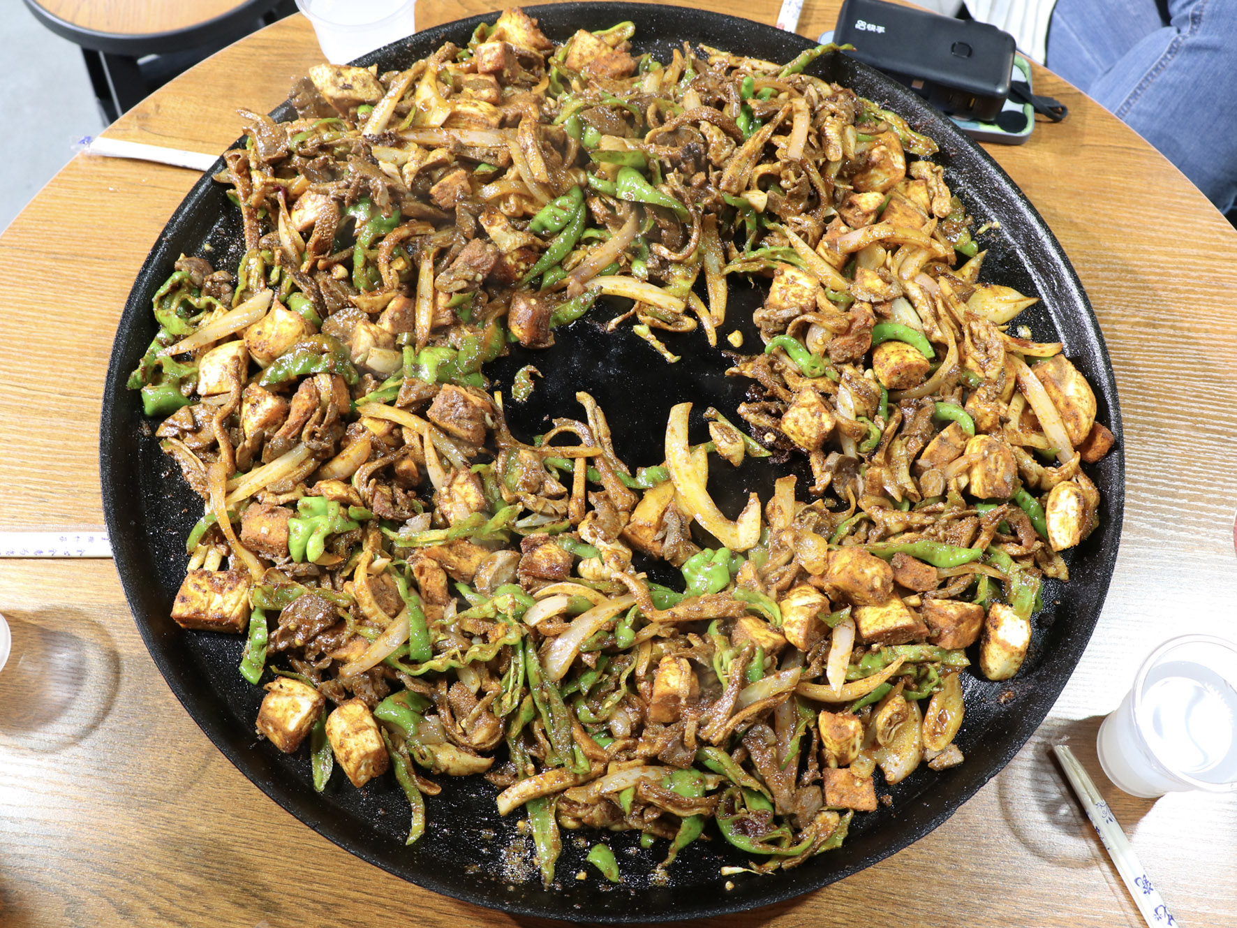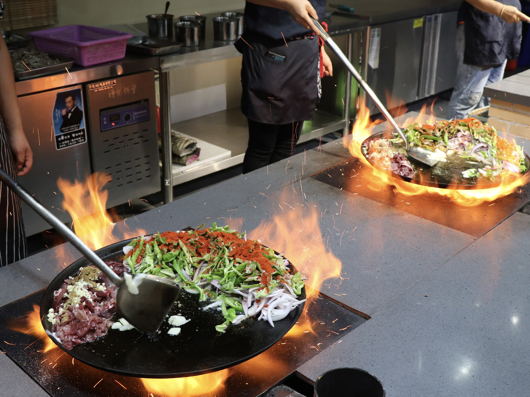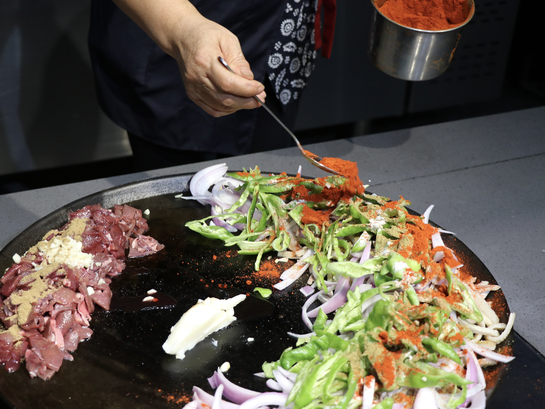 最美味的食物往往來自于最樸素的食材(cai),只見店家將(jiang)切好的羊肝、肺、肚(du)、腸、心等佐以洋蔥、青(qing)椒下入(ru)一(yi)個鑄鐵鏊子里(li),再加上幾勺鹽和辣椒面(mian),開(kai)始用猛火爆炒(chao),火星四濺,一(yi)頓(dun)撥(bo)拉之后,待到七分(fen)熟左右(you)再放入(ru)提前準(zhun)備好的白餅(bing)塊一(yi)起翻炒(chao)即可。