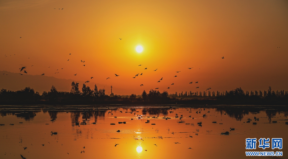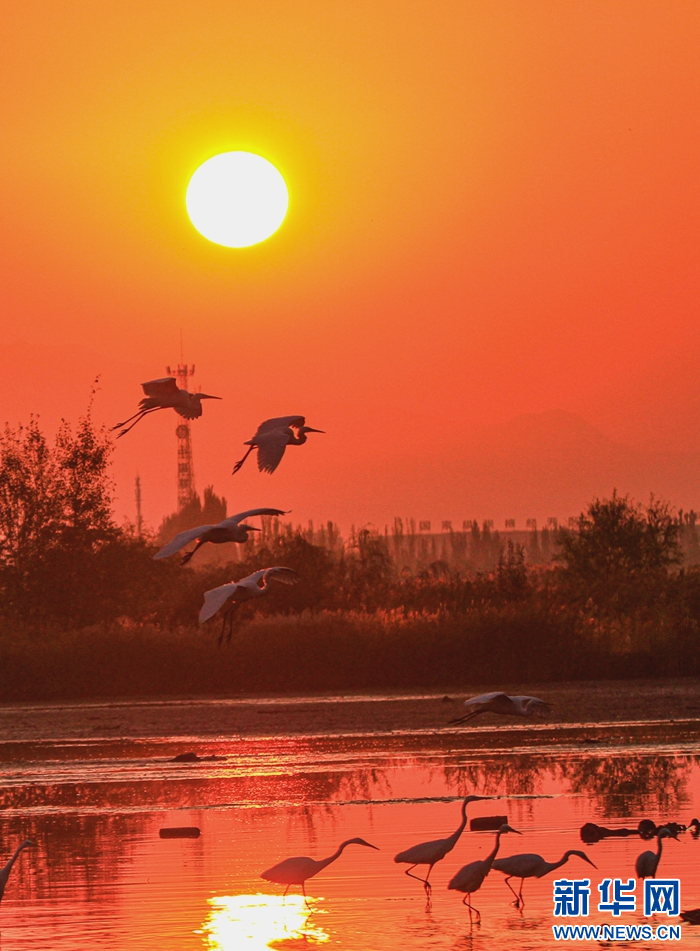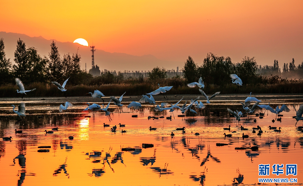 近日,在甘肅省張掖國家濕地(di)公園,成(cheng)群(qun)的(de)白鷺(lu)迎著朝陽悠然自得地(di)飛翔(xiang)、覓食、嬉戲,構成(cheng)了一幅朝陽伴鷺(lu)飛的(de)美麗畫(hua)卷(juan)。新(xin)華網發(陳禮 攝)