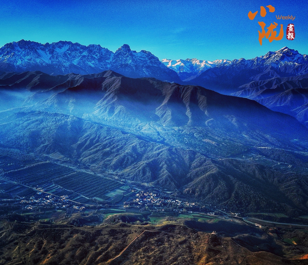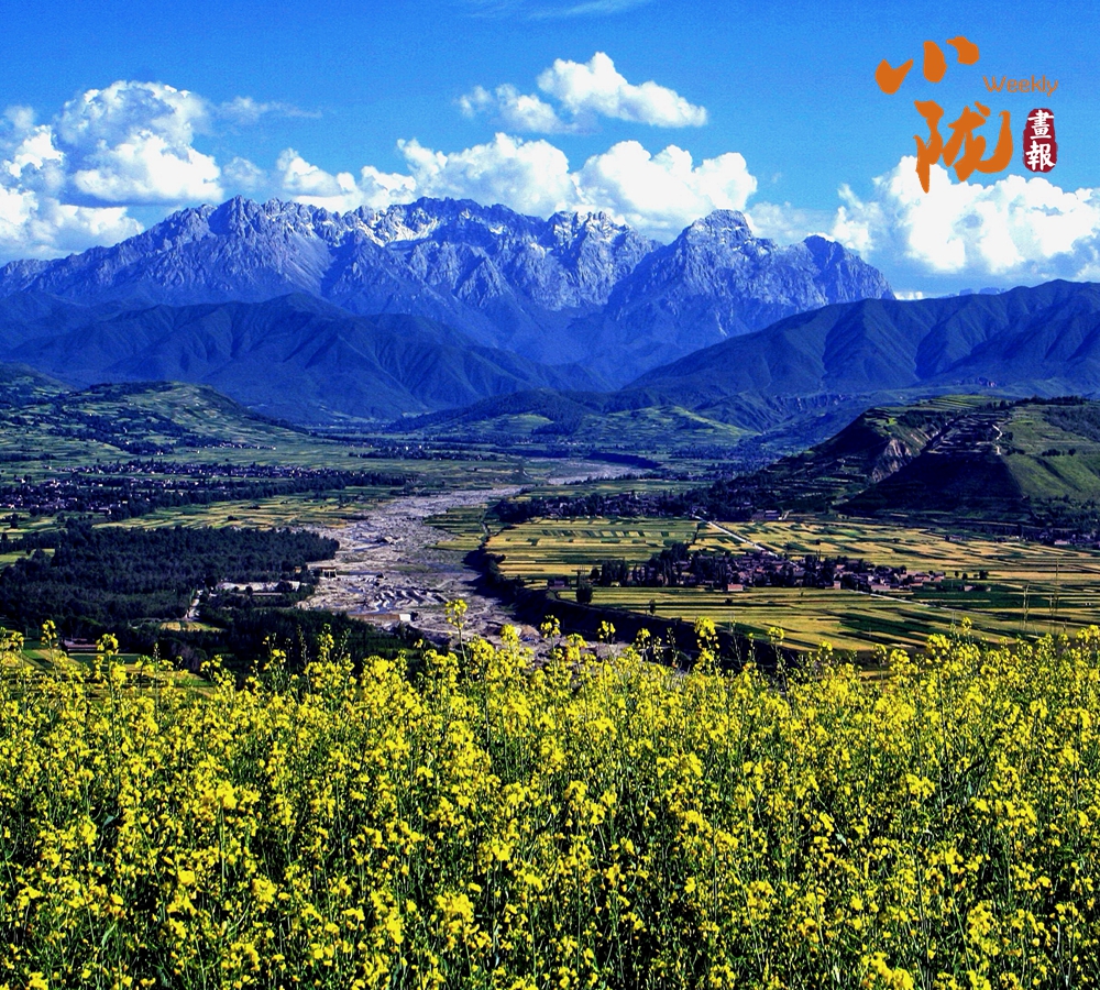 太(tai)子(zi)山白雪覆蓋,藍天、白云、村莊、綠樹、牛羊、油菜花,盡顯壯美風光。