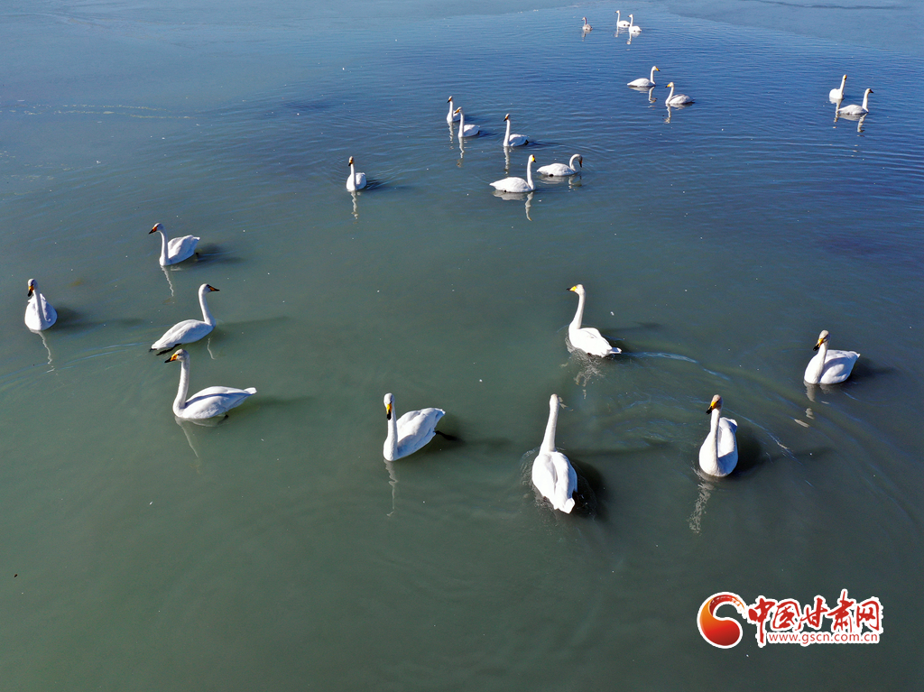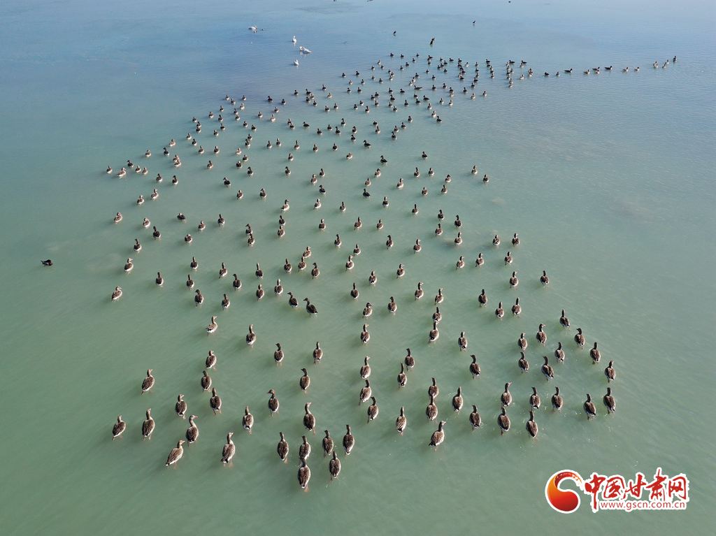 11月18日,在甘肅省張掖市臨澤縣新華農場湖面上,眾多天鵝、灰雁和綠頭鴨等候鳥在此越冬棲息。