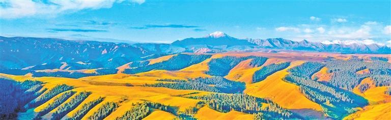 初冬的祁連山,顯示出獨特韻味。主峰在藍天白云的映襯下顯得肅穆大氣。周圍群峰羅列、層巒疊嶂,高低延綿的山脈在陽光的照耀下交相輝映,近處的群山被此起彼伏的林海包圍,像一道道美麗的波浪。祁連山脈山高、天藍,大自然賜予這片土地最原始的靈秀與遼闊。