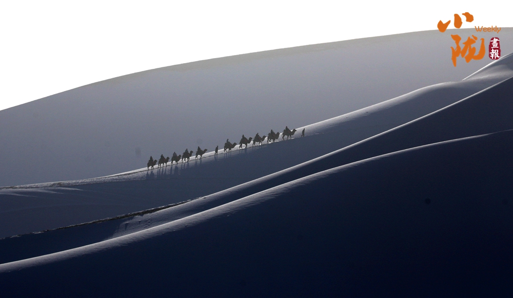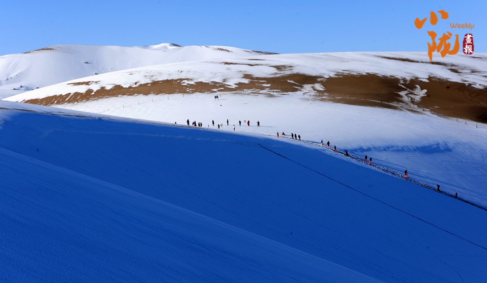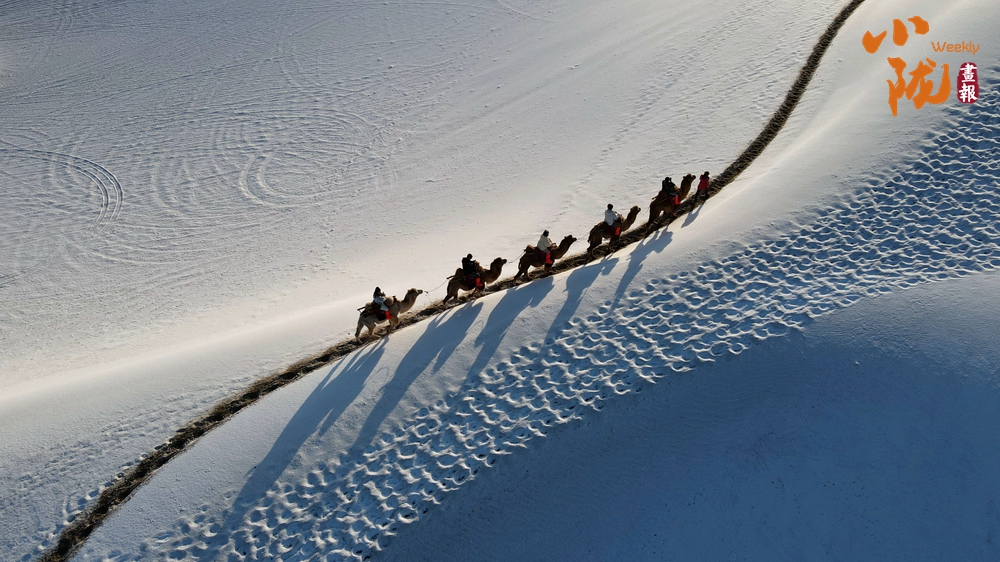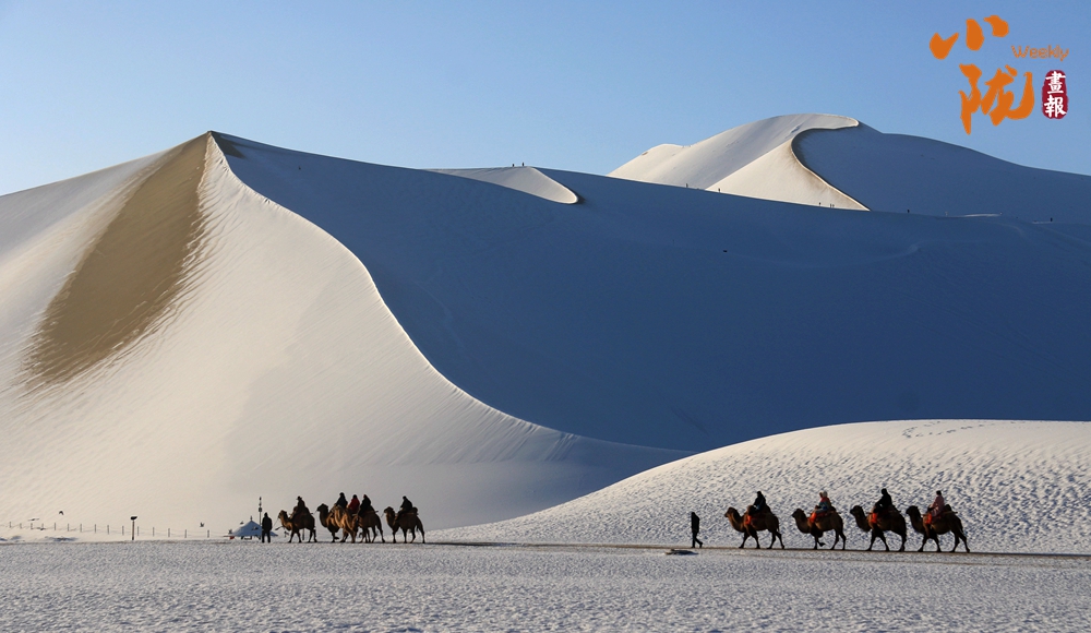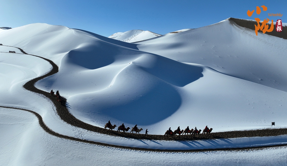 鳴沙山上,連綿不(bu)絕的沙海披上銀裝,放眼(yan)望去,如(ru)詩(shi)如(ru)畫,美不(bu)勝收,吸引了不(bu)少游客騎著駱駝踏雪賞景。