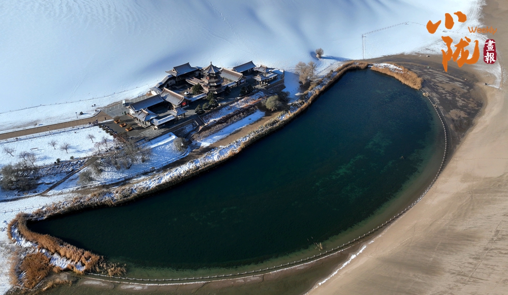 從空中俯瞰(kan),漫(man)漫(man)沙漠覆蓋著白雪,月牙(ya)泉成了沙漠的眼睛,構成另一幅(fu)美麗的沙海畫卷。
