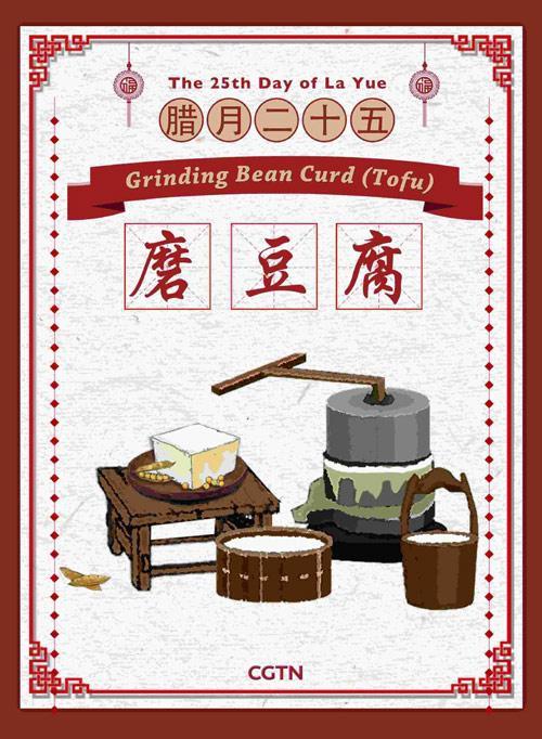 傳說玉皇大帝會在臘月二十五下凡巡視人間,看家家戶戶是否都過著誠實勤儉的生活。為了表現得節儉以獲得玉皇大帝降福,傳統上人們會磨豆腐來吃,豆腐在中國是一種便宜的食品。