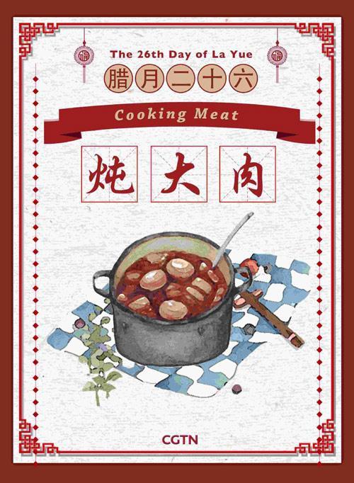 臘月二十六這天,許多家庭通常都會燉豬肉和吃豬肉。不養豬的家庭會去當地集市買一大塊肉。在過去的農業社會,人們只有在春節才能吃上肉。吃肉也代表著一年中最盛大的慶祝活動。