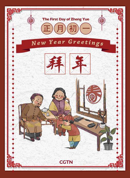 Embracing the first day of the New Year, people visit friends and relatives' homes and make New Year's greetings to each other. They use auspicious words to pray for good luck in the New Year.