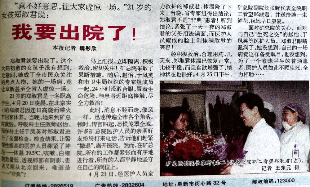 作為部門領導,她依然表現出色,2003年“非典”期間,她擔任阜新晚報要聞部主任,她提出“最危險的地方,我先上!”4月20日,有一個學生從北京回來,因為高燒不退被懷疑為感染“非典”,一時間謠言四起,恐慌籠罩全城,魏彤欣一個人冒著風險深入醫院跟蹤采訪,在得知確診不是“非典”后,第一時間發出了報道《我要出院了》,及時消除了公眾恐慌情緒。她帶領記者深入發熱門診、城市出入口的檢查站和醫護人員之間,掌握了大量的一手材料,共采寫了70余篇稿件,她本人被評為“遼寧省抗擊非典新聞宣傳先進個人”,她所在的部門被評為“遼寧省抗擊非典新聞宣傳先進集體”。