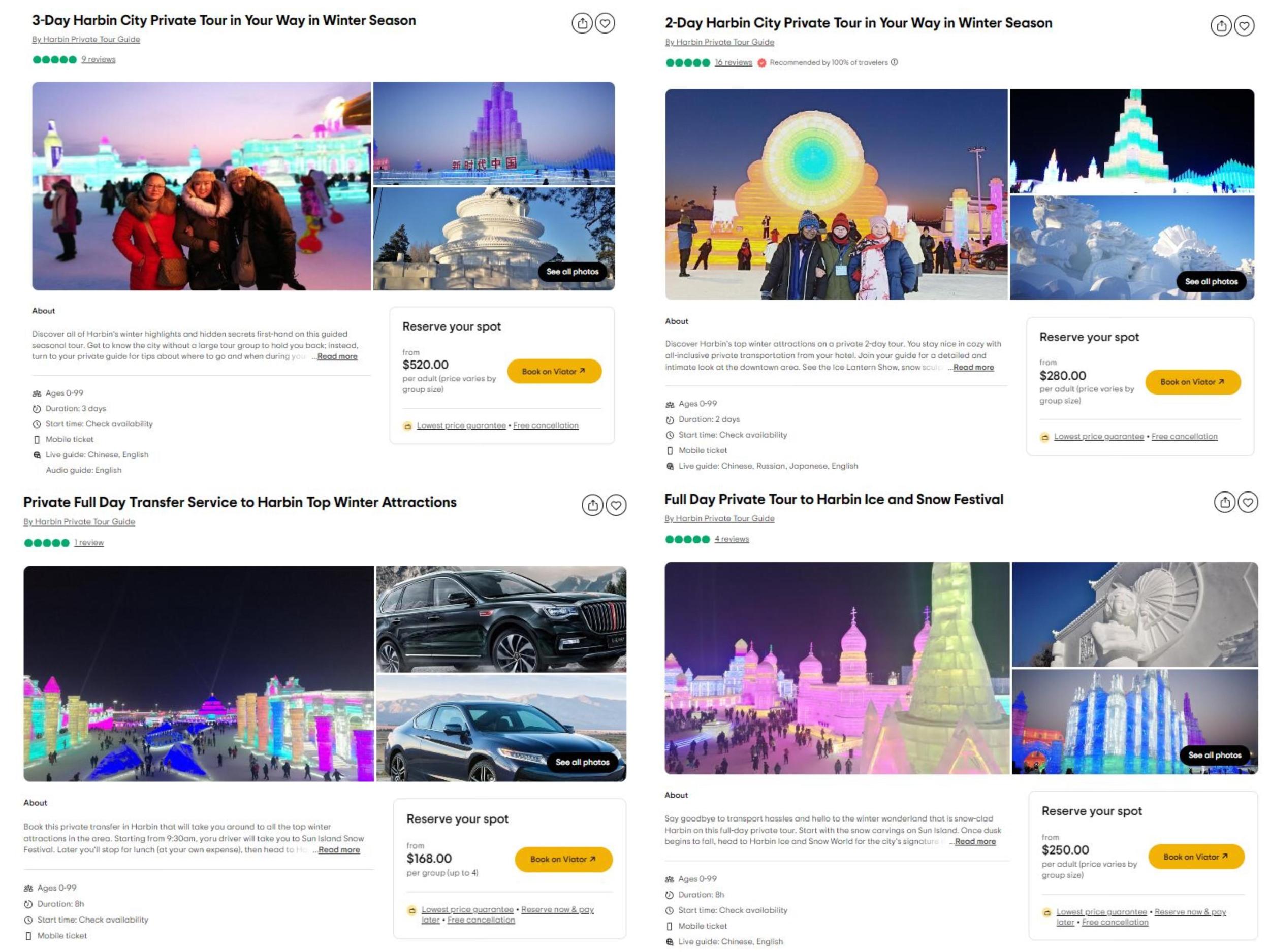 中新財經查看Tripadvisor網站發現,該平臺上有數十個關于哈爾濱旅游的服務。其中,“哈爾濱市冬季私人三日游”每位成人收費520美元起,“哈爾濱市冬季私人兩日游”每位成人收費280美元起,這兩個服務的費用不包括門票,包括私人導游服務、交通費(私人汽車或公交車/出租車)、酒店接送;“哈爾濱冬季熱門景點私人全日接送”每團收費168美元起(最多4人),費用不包括門票等,包括私人汽車、私人司機服務、燃油附加費。