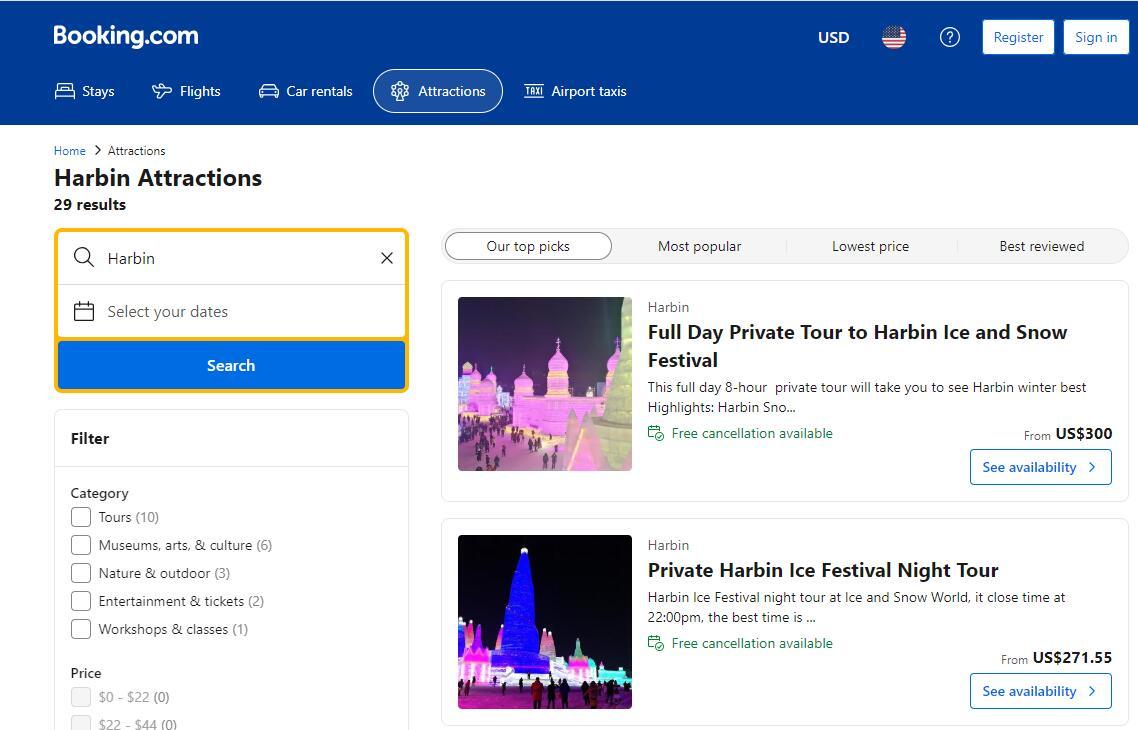 在酒店及住宿在線預訂平臺Booking.com上,可以搜索到近30個關于哈爾濱旅游的服務。其中,“哈爾濱冰雪節全日私人旅游”包括私人汽車和導游費用,不包括門票收費300美元,包括門票則收費480美元。“哈爾濱冰雪節私人夜游”包括私人汽車、私人旅游、酒店接送、門票,收費271.55美元起。