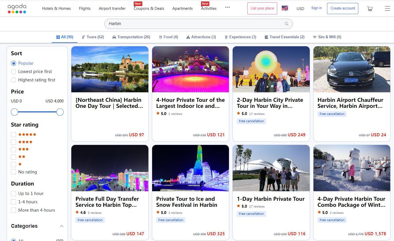 在線預訂平臺Agoda上也可以搜索到數十個關于哈爾濱旅游的服務。大約8小時的“哈爾濱一日游”,包括私人導游服務和用車費用,收費97美元起。為期2天的“哈爾濱市私人旅游”,包括私人導游服務、交通費(私人汽車或公交車/出租車)、酒店接送,收費249美元起。(中新網財經 記者 吳家駒)