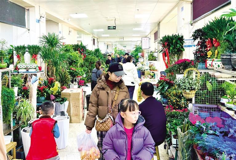 在市區花卉市場,花店已經擺出了各種新春花卉,供市民選購。在雁灘花鳥魚市場,花香四溢,花團錦簇,枝頭掛著豐收喜悅的小金桔、高貴典雅的蝴蝶蘭、暗香浮動的臘梅、喜慶吉祥的富貴子、花團錦簇的杜鵑花……各種寓意美好的年宵花被擺放在花店的顯眼處。正值周末,市民陸續前來觀賞、選購。