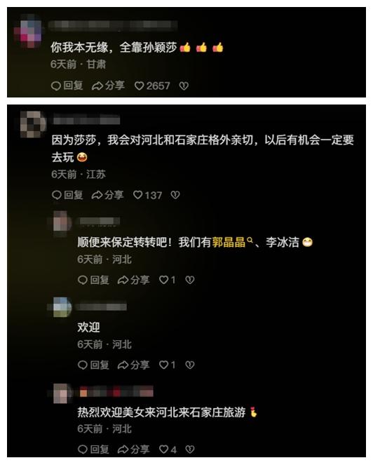 此前,多(duo)位(wei)網友向(xiang)石(shi)家(jia)(jia)莊(zhuang)市文(wen)化廣電和旅游局官(guan)方賬號“石(shi)家(jia)(jia)莊(zhuang)文(wen)旅之聲”留(liu)言,表示(shi)想(xiang)看國乒名(ming)將孫(sun)穎(ying)莎(sha)(sha)代(dai)言家(jia)(jia)鄉。公開(kai)資料顯(xian)示(shi),出(chu)生于河(he)北省石(shi)家(jia)(jia)莊(zhuang)市的(de)孫(sun)穎(ying)莎(sha)(sha)在此開(kai)啟(qi)了乒乓球生涯。