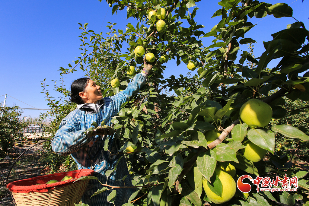 8月17日,位于祁連山下的甘肅省嘉峪關市文殊鎮豐源農業科技示范園1850余畝戈壁早酥梨喜獲豐收,果農們正忙著采摘、分揀、裝箱、儲存。