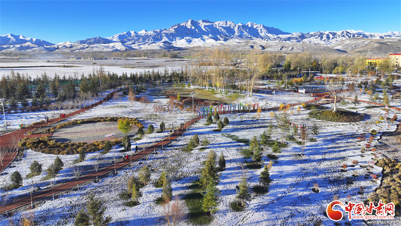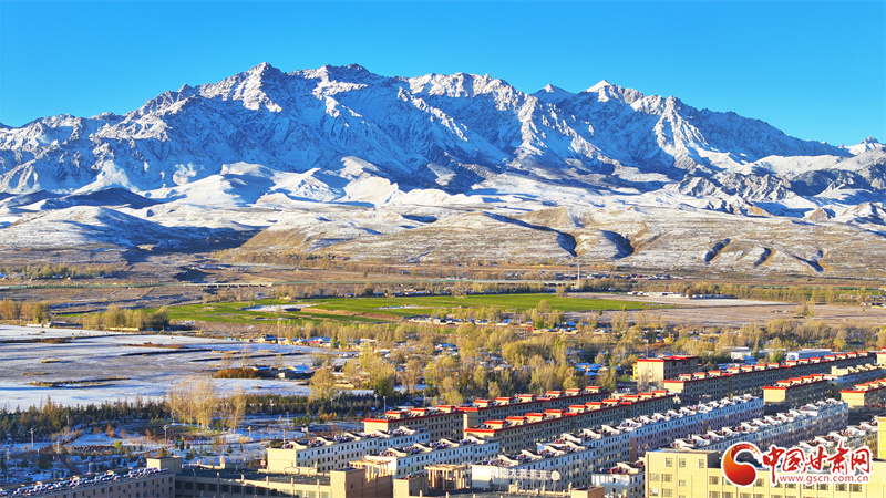 10月22日,雪后初晴的張掖市民樂縣,連綿起伏的祁連山被皚皚白雪覆蓋,整個縣城一片銀裝素裹,在晨曦的照射下,呈現出一幅多姿多彩、生態和諧的美麗畫卷。