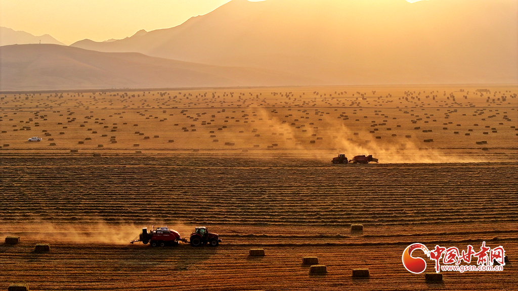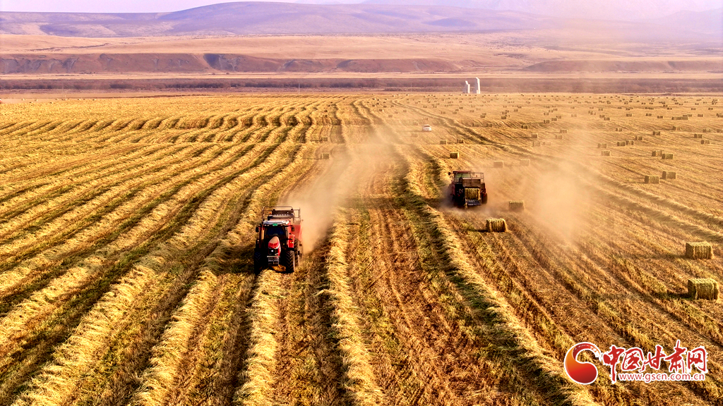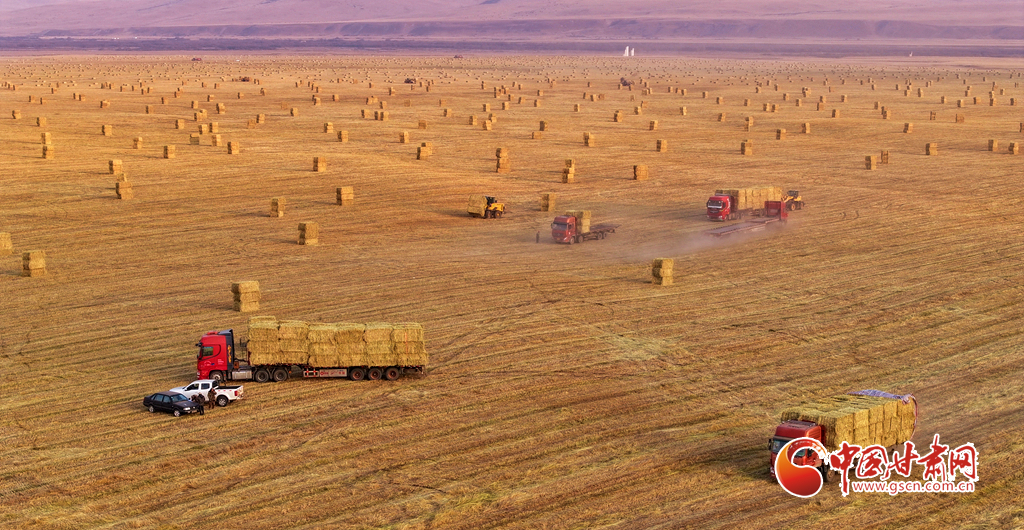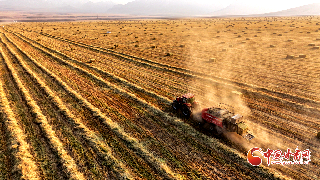 11月11日,甘肅山丹馬場的10萬畝燕麥草進入打包高峰期,田野上呈現出一派繁忙而有序的景象。放眼田間,大型農用機械來回穿梭,將燕麥草迅速壓縮、打包,一個個草捆整齊排列。與此同時,滿載草捆的運輸車在田間小道上來回奔波,將成品送往倉庫和銷售地。