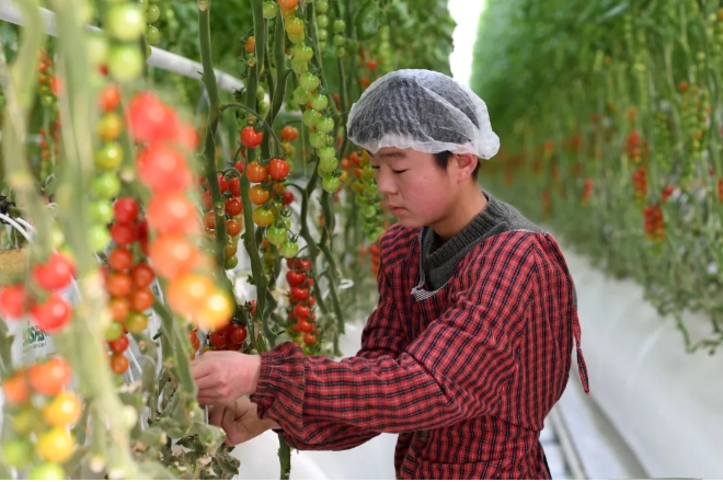 在古浪縣黃花灘生態移民區富民新村現代化智能玻璃溫室,村民在管護番茄 范培珅 攝
