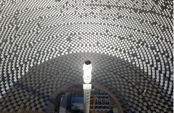 人們驚呼,這是自然力與人類智慧的完美創造:戈壁荒灘上“種”出了人造太陽。這個100兆瓦熔鹽塔式光熱電站,占地面積相當于780個足球場,每年所生產的綠電可減排35萬噸二氧化碳。