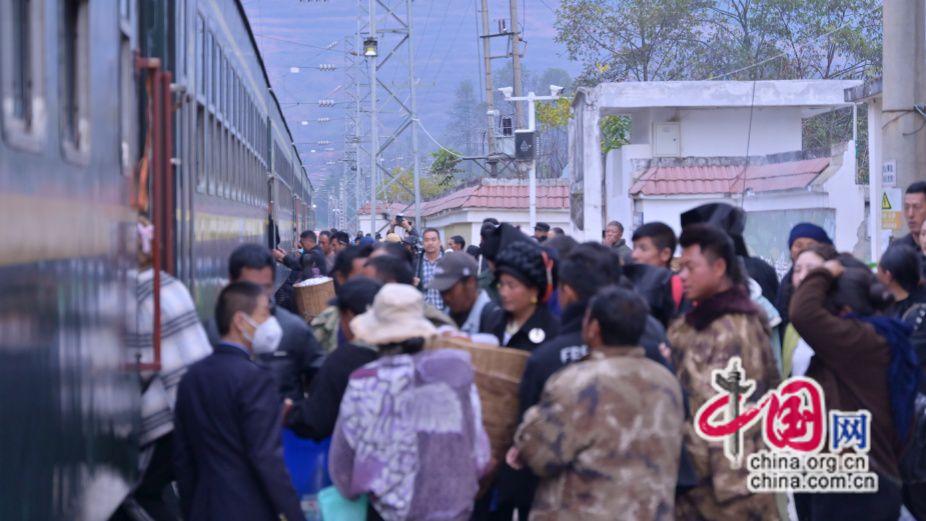 2024年11月20日,彝(yi)歷(li)新(xin)年第一天,成昆線(xian)5633次(ci)慢火車停靠(kao)在站臺,彝(yi)族同胞(bao)有序乘車。原波 攝