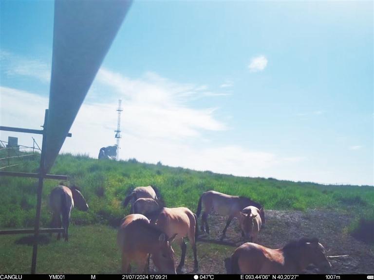 近日,甘肅敦煌西湖國家級自然保護區管護中心工作人員整理紅外相機拍攝畫面時,發現拍攝到普氏野馬“哺乳”的清晰影像。畫面拍攝于今年7月下旬,有8匹普氏野馬繁殖群正在馬圈灣濕地的飲水泉附近活動,其中有一匹小馬駒滿足地吸吮著母馬的乳汁。據監測,該小馬駒出生于6月上旬,畫面中約已有一個半月大小,身體健康,毛色光亮。這個繁殖群領地范圍主要從馬圈灣西觀景臺至馬圈灣東高地,該區域可采食物種類豐富、水源充沛,是適合普氏野馬生活的美麗家園。普氏野馬是國家一級重點保護動物,常棲息于山地、草原和荒漠,性機警、善奔跑。近年來,隨著敦煌西湖保護區生態環境保護力度加大,生態環境質量持續改善,群眾保護野生動植物的意識不斷增強,使野生動物活動范圍不斷擴大,種群數量不斷增加。截至目前,敦煌西湖保護區內普氏野馬種群數量已達166匹。