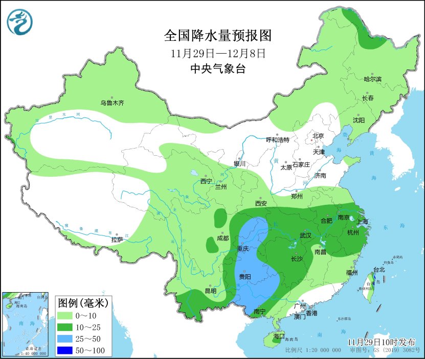 未來10天(11月29日-12月8日),東北地區中北部、內蒙古東北部等地部分地區累計降水量有8~15毫米;西南地區東部和南部、江漢、江淮、江南西部和北部、廣西西部及臺灣島等地部分地區有10~20毫米,局地30~60毫米;云貴高原、內蒙古東北部、東北地區等地部分地區累計降水量較常年同期偏多1~3倍,我國其余大部地區降水偏少。