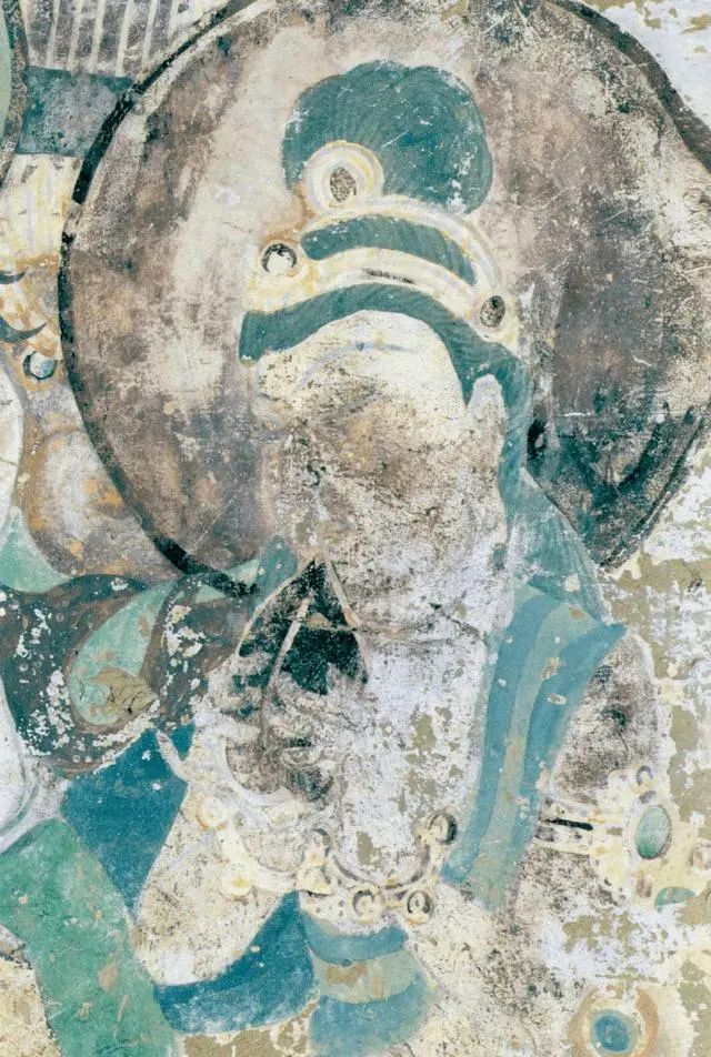 (2)莫高窟第130窟飛天壁畫修復當我在第161窟修復壁畫時,突然聽到洞窟外一聲巨響,我猜想,應該是洞窟發生了坍塌。于是我趕緊循聲而去,發現發出巨大聲響的是第130窟,第130窟北壁上部壁畫為飛天,其中空鼓壁畫大面積脫落,有2平方米多。脫落的壁畫掉在了佛腳上,碎成了一地。未脫落壁畫的邊緣十幾厘米都已脫離墻壁,隨時有脫落的風險。我于是向常書鴻先生匯報,然后我們上報國家文化部。國家文化部批示,對第130窟進行加固維修。