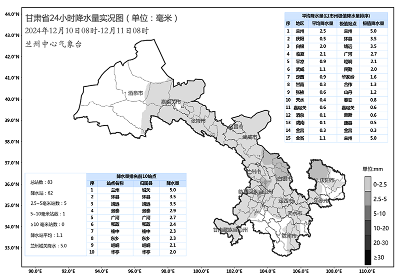 中國甘肅網12月11日訊(西北角·中國甘肅網記者 沈文剛)12月10日8時至12月11日8時,全省共計62個縣區出現小雪,其中蘭州主城區出現大雪,慶陽北部、白銀中部和北部、臨夏西南部出現中雪。較大降水量出現在蘭州本站5.0mm、靖遠3.5mm、環縣3.5mm、景泰2.9mm、廣河2.7mm。