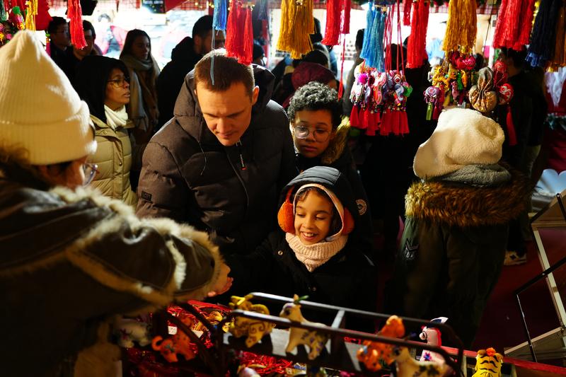 (法國巴黎圣誕集市慶(qing)陽(yang)香包展位(wei)上,一位(wei)外國友人正在購買心儀的(de)“虎(hu)頭枕”香包。)