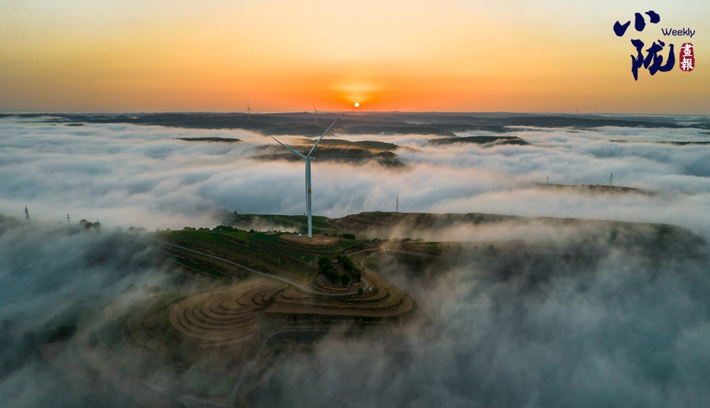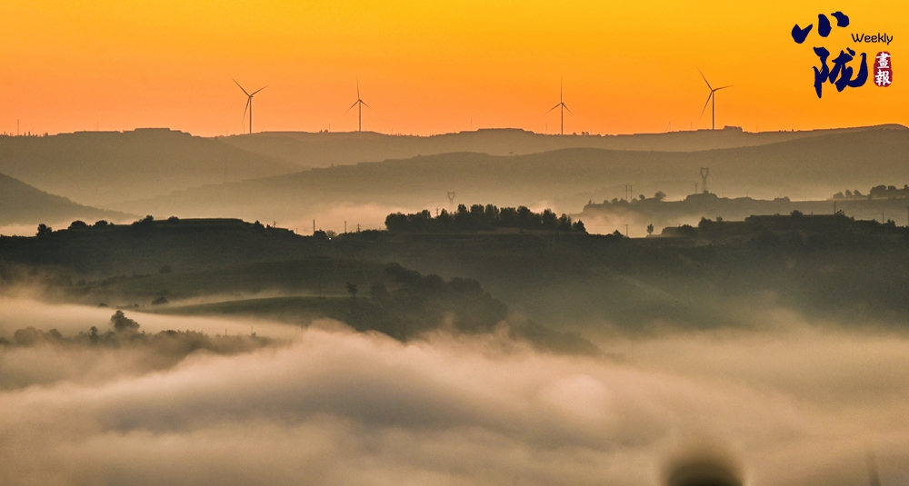 云霧如海浪般向四周漫延,呈現出別樣的霧海景觀,聳立在山川梁峁間的風力發電機隨風律動,成為當地一道獨特的風景。