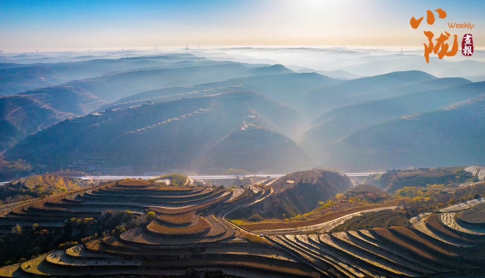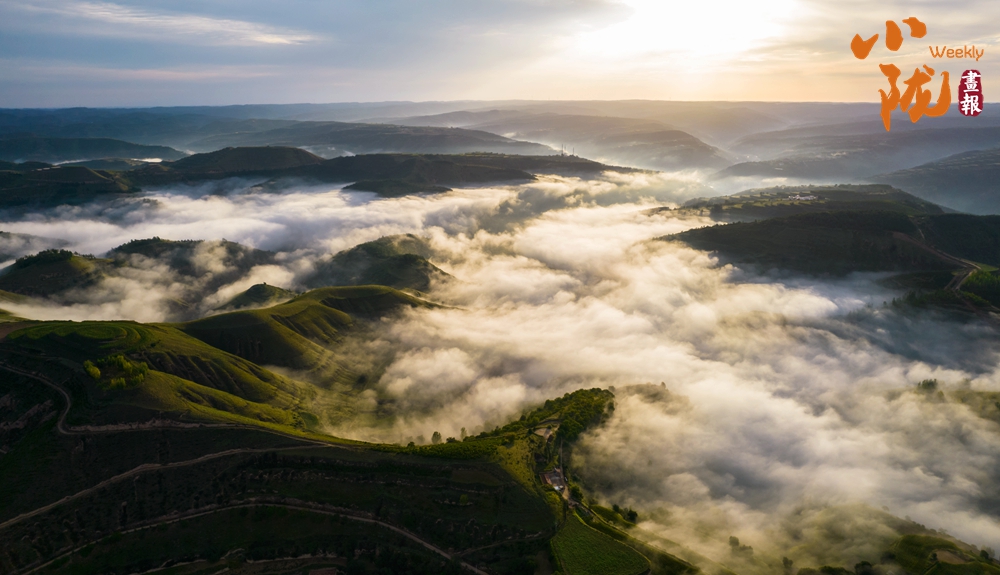 連綿起伏的山巒在云霧中若隱若現,霧氣彌漫將溝峁山梁籠罩,形成一幅水墨風光畫。