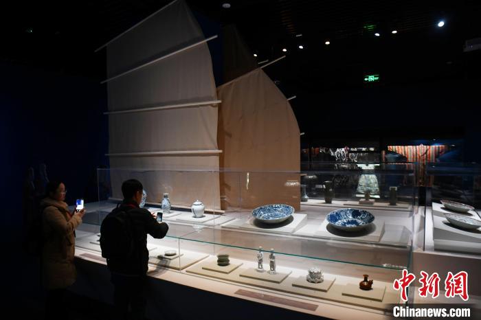 12月21日,“傳奇之旅:馬可·波羅與絲綢之路上的世界”展覽在四川博物院正式面向公眾開放。圖為觀眾參觀現場展出的中國元代青花瓷系列展品。 中新社記者 張浪 攝